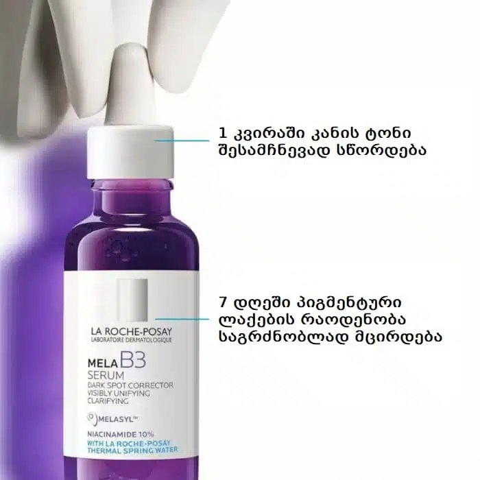 სიელი წარმოგიდგენთ: პიგმენტების საწინააღმდეგო შრატი B3 Mela Serum La Roche. დერმატოლოგებთან პარტნიორობით La Roche-Posay ავითარებს კანის მოვლის ინოვაციურ ფორმულებს. ჩვენს დაბერების საწინააღმდეგო პროდუქტებს გააჩნიათ აქტიური მოლეკულების ოპტიმალური კონცენტრაცია, რაც საშუალებას გვაძლევს მივაღწიოთ ფორმულის მაღალ ეფექტურობას და შევინარჩუნოთ დადასტურებული ტოლერანტობა მგრძნობიარე კანისთვისაც კი.