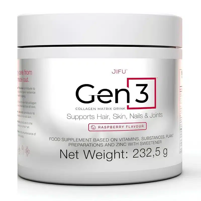 სასმელი კოლაგენი ფხვნილის სახით – Jifu Gen3 Collagen Matrix Drink, მხარს უჭერს თმის ჯანმრთელობას, კანს, ფრჩხილებს და სახსრებს. კოლაგენური პეპტიდები ხელს უწყობს სახსრების დისკომფორტის შემცირებას, კანის ელასტიურობას და ჯანსაღ დაბერებას. ვიტამინი C ხელს უწყობს კოლაგენის ნორმალურ წარმოქმნას, კანის ნორმალური ფუნქციონირებისთვის ბიოტინი, ნიაცინი და თუთია ხელს უწყობს ნორმალური კანის შენარჩუნებას. თუთია ხელს უწყობს ნორმალური თმის შენარჩუნებას, თუთია ხელს უწყობს ნორმალური ფრჩხილების შენარჩუნებას.